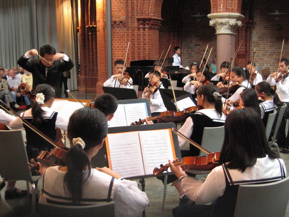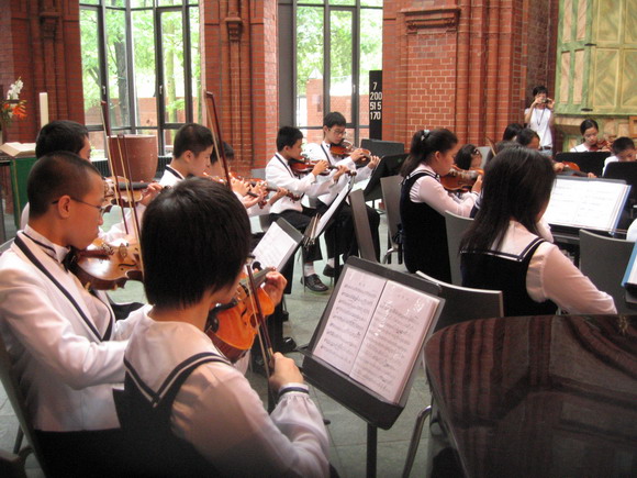 此次中德青少年节专场音乐会只有一场,分上下两个专场,是在全部参加该节的数十个团队中挑选出来的两个优秀团队担当。除了少年宫弦乐团之外,另一个是德国柏林海勒斯区青少年合唱团,该团被誉为柏林“具有最纯净声音”的合唱团。该团曾参加过历届中德青少年节来到中国。他听了弦乐团演奏后,对该团队的水平赞叹不已,对我们表示非常希望能再次来中国和少年宫团队交流活动。
