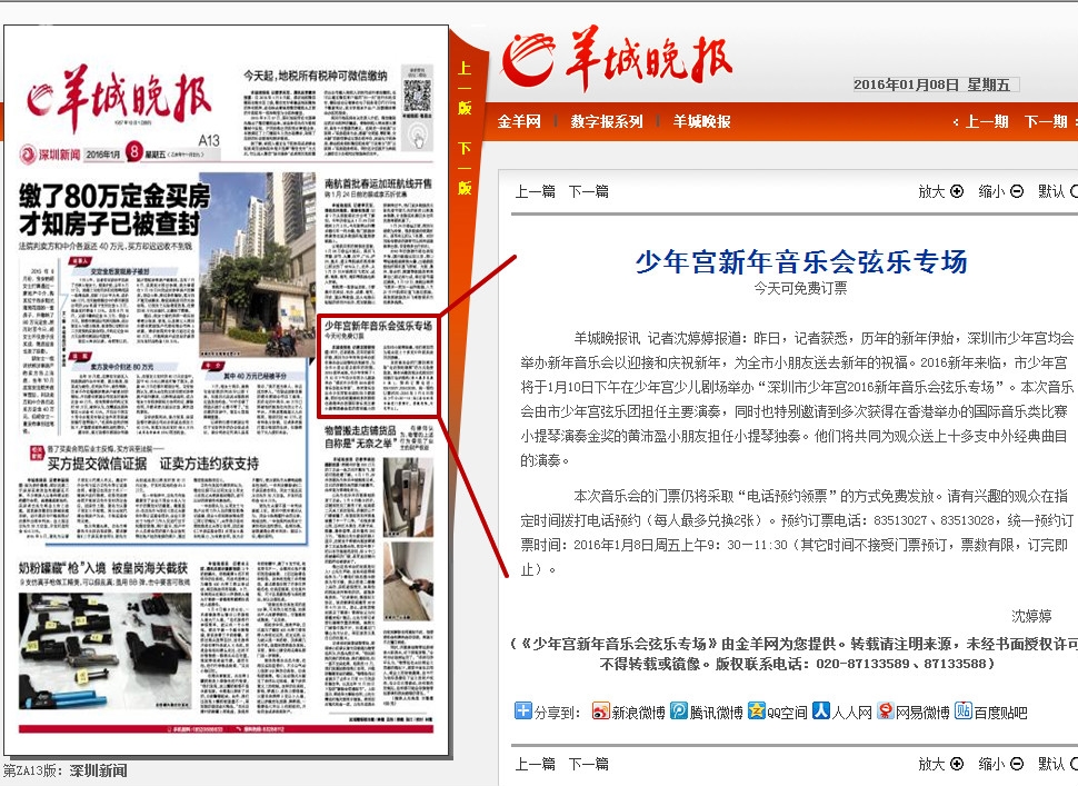 〖羊城晚报〗少年宫新年音乐会弦乐专场今天可免费订票