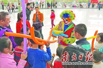 小丑演员向小朋友赠送手扭气球。