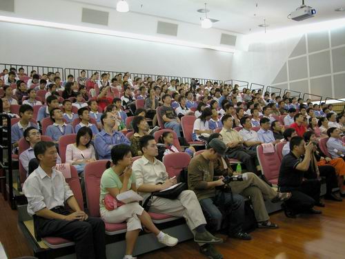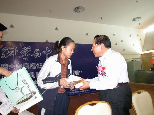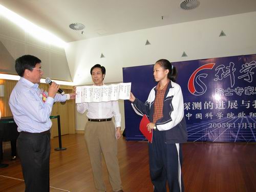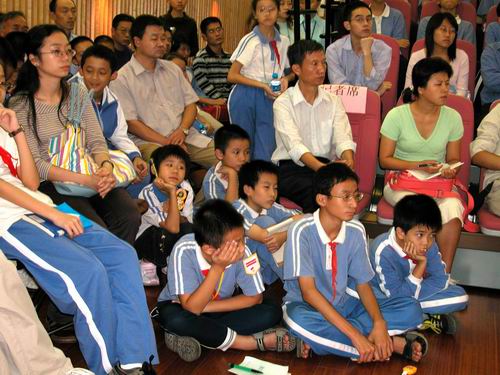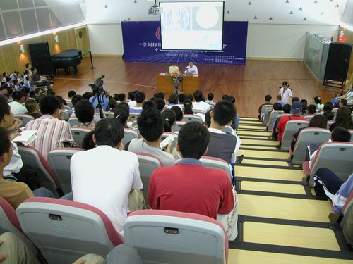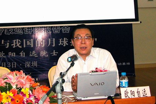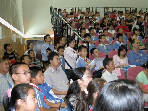今日下午,少年宫三楼音乐厅座无虚席,场面热烈,中国科学院院士、 第三世界科学院院士、中国月球探测工程首席科学家欧阳自远的《空间探测的进展与我国的月球探测》科普报告会在这里举行。来自深圳各学校的领导、科技教师、深圳市少年科学院小院士,以及各大、中、小学校科技活动小组的学生、科技实验班的学生和社区科协工作者等300多人参加了报告会。欧阳院士的精彩演讲激发了在座听众的极大兴趣,引来了听众们热烈而持久的掌声。