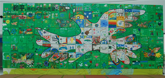 当130余幅图画完成后,活动主办者将这些作品在大厅的巨大墙面上排列组合成一幅高5米宽10米的一只衔橄榄枝的和平鸽画面。据介绍,这幅象征六国和平友好的巨幅画作将由市少年宫保存。