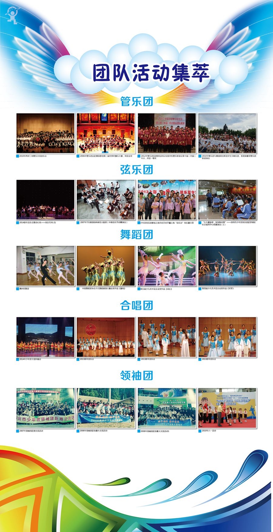 除此之外,团队多次出外参加比赛和交流,2006年8月,交响管乐团赴美国参加“第二届吹奏乐队大赛(WCB)”,获世界金奖,世界级专家评委甚至用“不可思议的演奏”来形容乐团的水平;同月,舞蹈团赴香港参加第三届国际青少年“金紫荆花奖”音乐、舞蹈、艺术大赛,在100多支代表团中脱颖而出,勇夺三项金奖;2007年,弦乐团赴德国参加“中德青少年节”获得嘉奖,在柏林神圣大教堂的演出更是引起当地市民的惊叹;同年,领袖团两次赴香港与香港童军交流,活动均取得极大成功;同年7月,民乐团赴台湾与当地优秀民乐团交流演出,得到台湾业届赞赏和对方团队的好评,并在今年演出季中迎来该团前来再次交流演出;2012年6月少年宫民乐团参加第十届少儿艺术花会(乙组)比赛中,荣获银奖;2008年7月,交响管乐团与台湾优秀团队进行交流演出。2012年6月少年宫管乐团参加第十届少儿艺术花会(乙组)比赛中,荣获银奖;2009年深圳第九届少儿艺术花会上,少年宫艺术团捷报频传,在中小学生乙组艺术表演类的比赛中,少年宫舞蹈团、交响管乐团和弦乐团在比赛中勇夺两金一银,以优异成绩在花会上展现少年宫艺术团的绚丽风采。短短十年时间,少年宫艺术团不仅成为了少年宫的一张亮丽名片,也逐渐发展为展示我市少儿艺术教育成果的一面旗帜。2011年少年宫舞蹈团被邀参加澳门第三十一届校际舞蹈节嘉宾演出,节目受到澳门舞蹈家协会高度评价,场下的观众掌声不断。2012年创作作品《成长》获深圳市少儿艺术花会决赛金奖;《渔童、渔饵、鱼》获花会铜奖;少年宫弦乐团参加2011奥地利萨尔茨堡音乐节,荣获一等奖的好成绩。2012年6月少年宫弦乐团参加第十届少儿艺术花会(乙组)比赛中,荣获银奖;