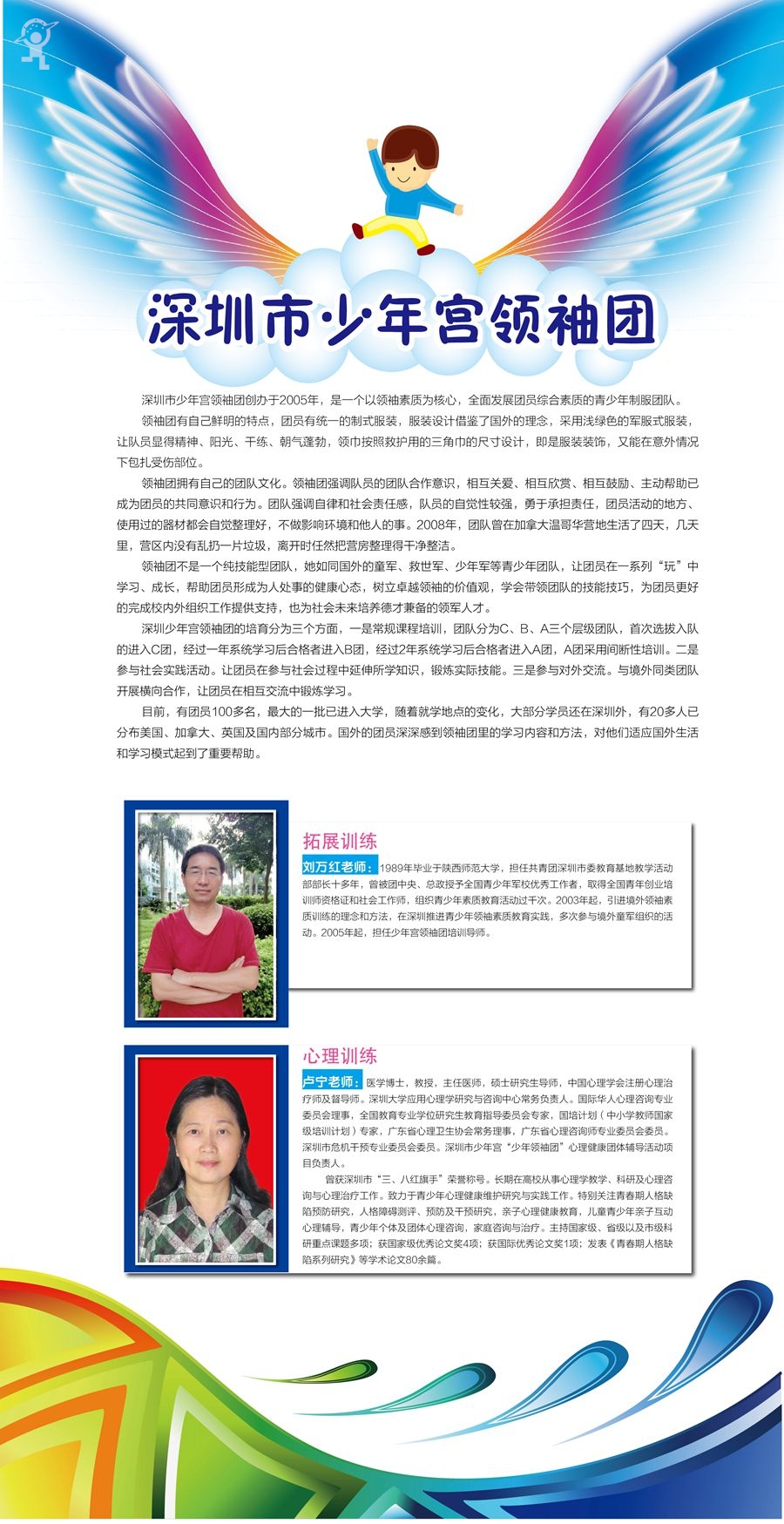 除艺术团之外,另一支开展招募活动的少年宫领袖团是深圳市少年宫于2005年4月创建的以德育教育为主的校外团队。团队旨在激发学生强烈的国家民族意识和社会责任感,形成良好的社会公德,帮助学生提高自我保护和生存能力,健全人格,完善自我,培养学生的领袖素质和综合能力。团队有严格的组织架构和内部运行机制,统一制服。成立以来,团队通过学校推荐和招募考试等形式,吸收了一批优秀学生进行拓展和心理等专业训练,并通过实践活动培养团员的领袖才能,为学校和社会培养一批学生领袖。除专业训练外,团员们经常参加社会服务以及少年宫内外各种大型活动等,在各项大型主题活动中,发挥学生领袖的号召力和引领作用,在家庭、学校和社会中,发挥良好作用。 团队多次和童军交流活动。2007年8月和11月,分别前往香港参加童军交流活动和观摩童军大会操。2008年7月,团队赴加拿大与温哥华童军交流,活动取得巨大成功。同年8月,温哥华童军回访少年宫,与香港童军和领袖团再次开展交流活动。领袖团成立以来,得到学生、家长和教育工作者以及社会公众的认可和高度评价,2011年暑假,领袖团全体团员赴腾讯参观学习,收获颇多。