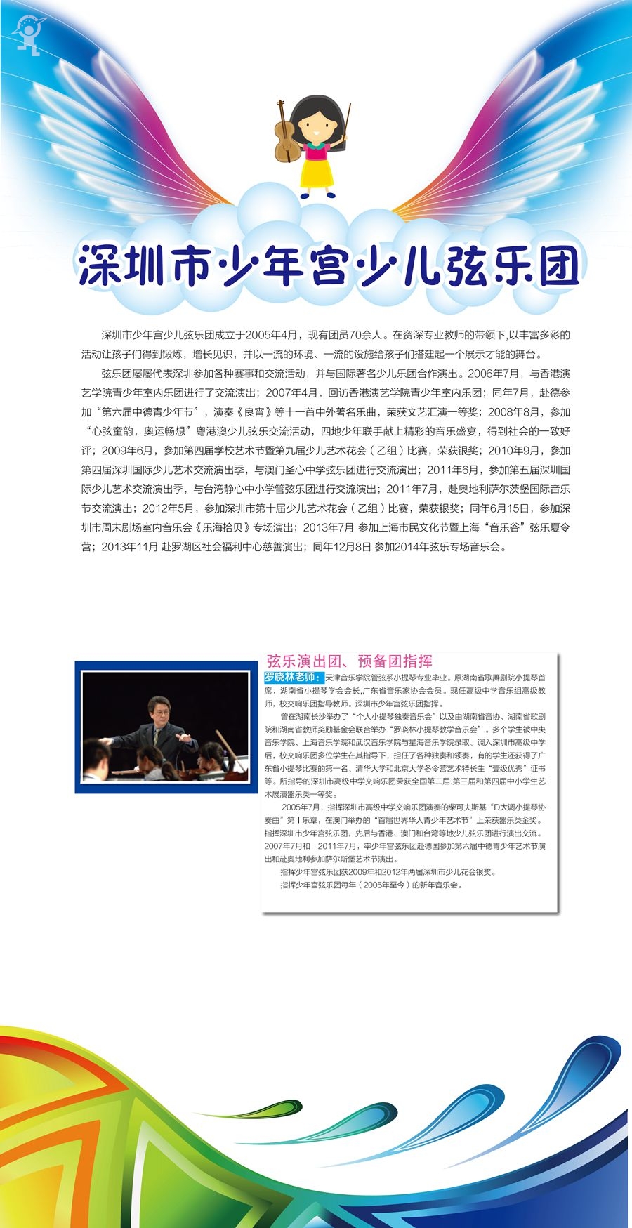 市少年宫艺术团成立于2005年2月,十年来,已发展成为一支高素质高水平的艺术团队,成为培养各类少儿艺术人才的摇篮,长期以来,倍受业界和社会关注。少年宫艺术团不仅拥有先进的教育理念,一流的活动设施,还聘请了一级的导师和指挥,吸收了深圳最优秀的少儿艺术人才,为孩子们提供广阔的艺术展示平台。