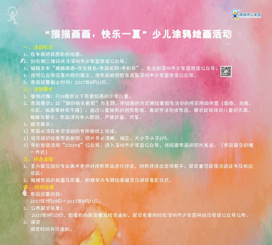 为丰富少年儿童的暑期生活,让他们度过一个快乐、健康、有意义的假期,并搭建一个全市少年儿童以画交流的体验分享平台,深圳市少年宫于7月29日-8月31日间举办“描描画画,快乐一夏”少儿涂鸦绘画活动。