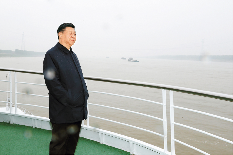 2018年4月26日下午,中共中央总书记、国家主席、中央军委主席习近平在武汉主持召开深入推动长江经济带发展座谈会并发表重要讲话。这是座谈会前,习近平于25日上午乘船沿江察看两岸生态环境和发展建设情况。 新华社记者 谢环驰/摄